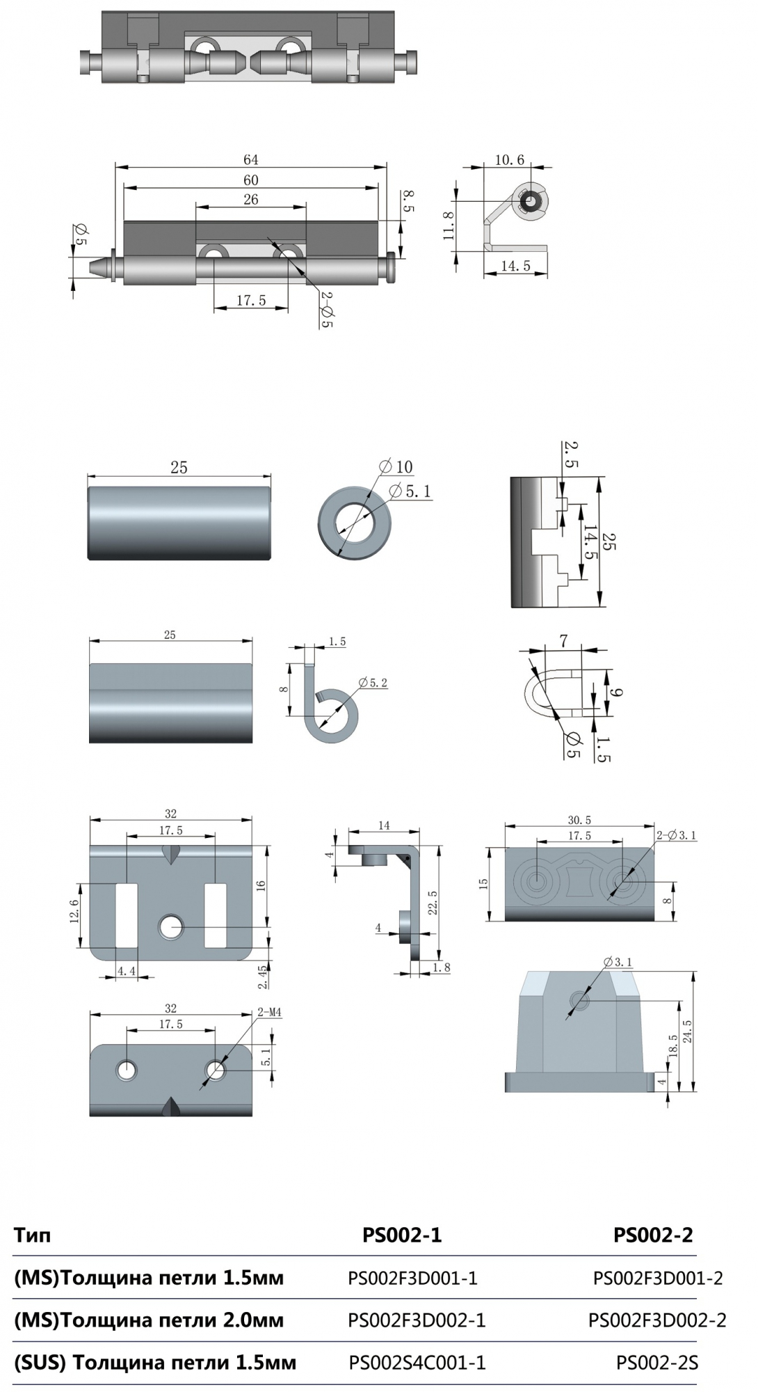 Петля PS-002-MS (нержавеющая сталь)